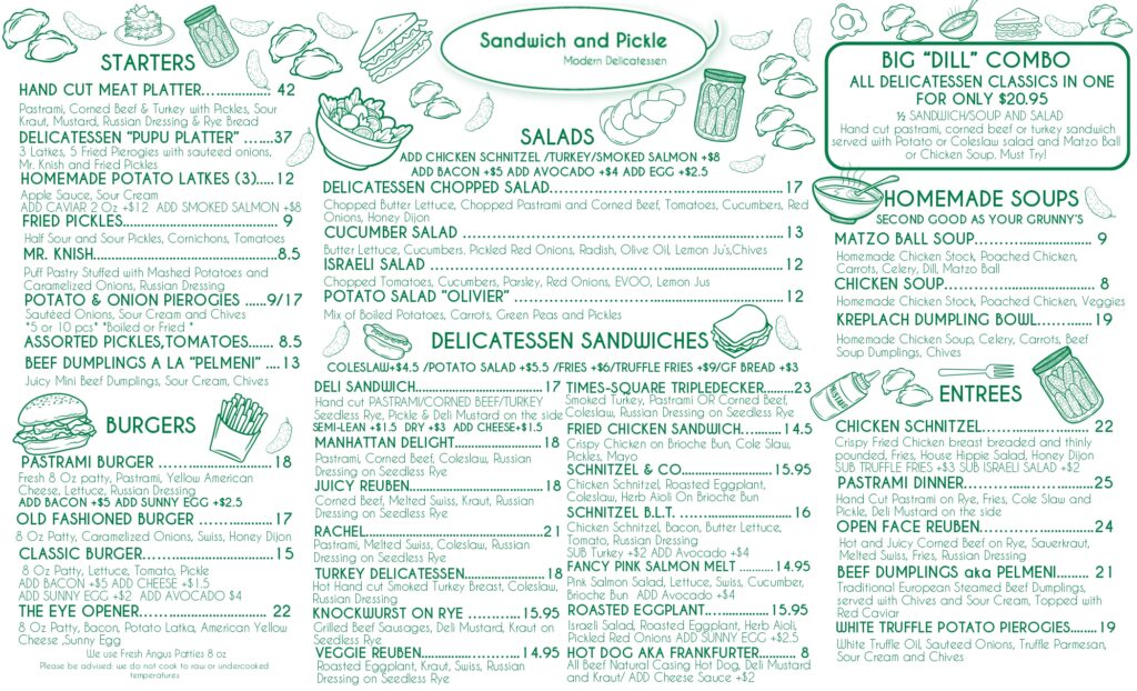 Sandwich & Pickle is one of NYC’s best Modern Delicatessen Restaurants — a must-visit spot for anyone who loves bold, handcrafted flavors. The menu celebrates the city’s deli tradition with stacked sandwiches with premium meats, house-made pickles and salads. From classic pastrami and corned beef to inventive drink specials and seasonal sides. Whether you’re grabbing lunch or planning your next comfort-food craving, Sandwich & Pickle is the place to go for authentic New York deli flavor done right.